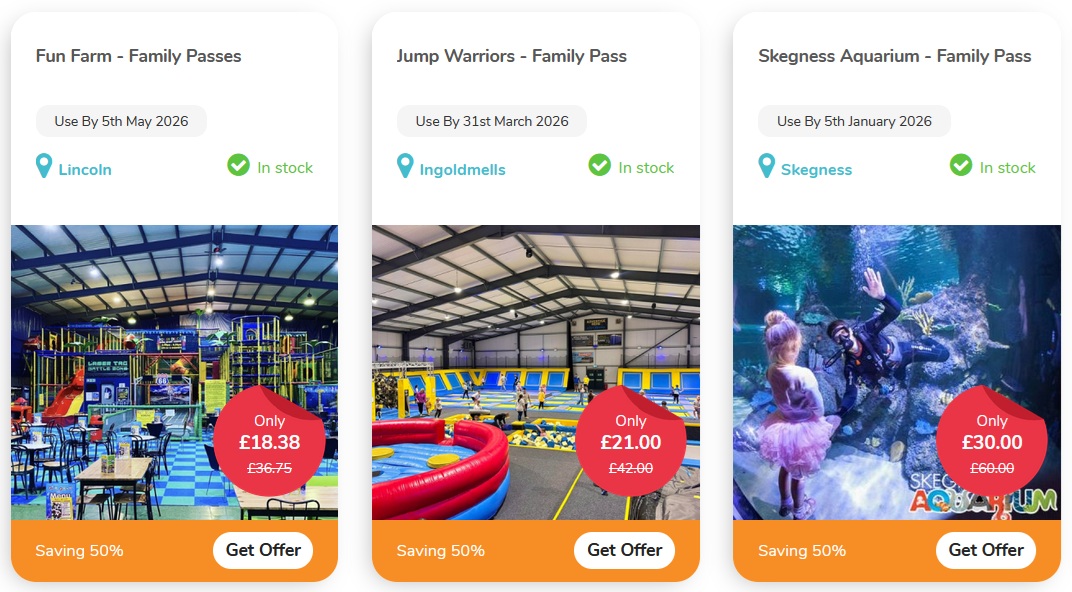 Offers include a good variety of e-vouchers for activities such as Skegness Aquarium and Jump Warriors. The dates change regularly so you can always find something to do during your stay in the area and of course it is bookable in advance, so no queueing for tickets.
